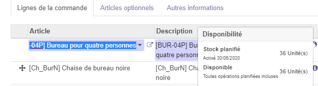 La bonne nouveauté dans odoo 13, est que vous pouvez visualiser la quantité disponible sur la ligne de devis/Commande , en cliquant sous la lettre i.