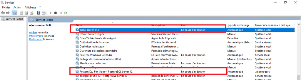 Si tout marche, vous devez avoir l’état de service comme (En Cours d'exécution) pour le service Odoo-14 et PostgreSql.