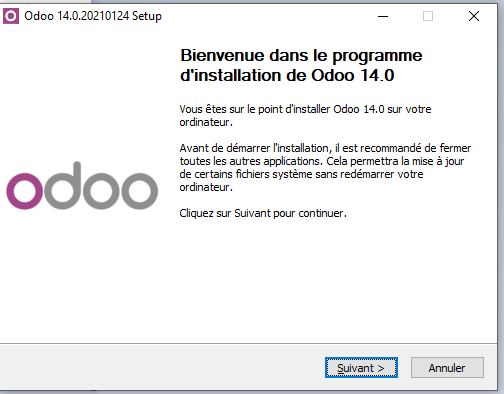 Après la fin du téléchargement, lancer l’exécutable et suivez les instructions , l’installation d’Odoo 14 est pratiquement comme toute installation d’une autre application Windows.