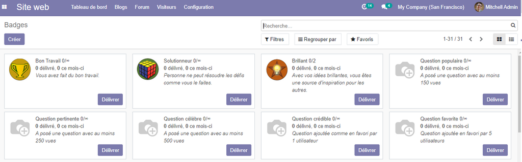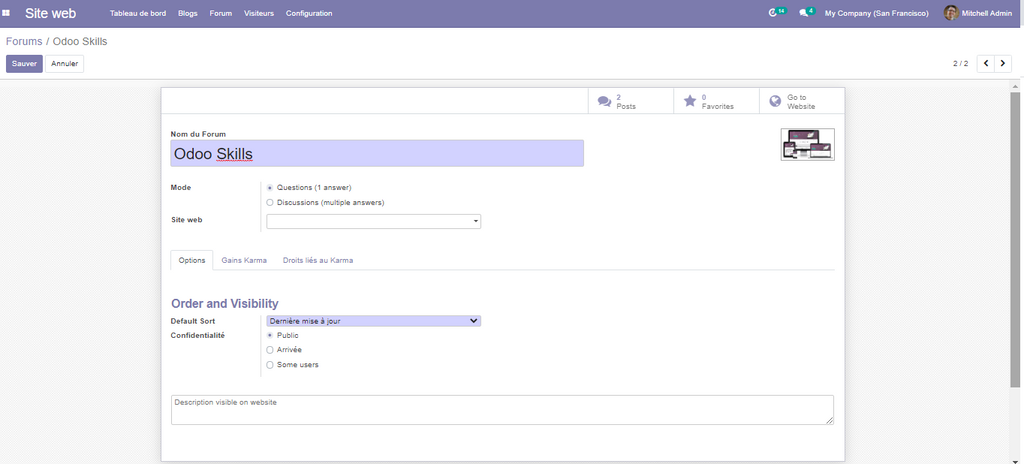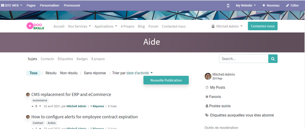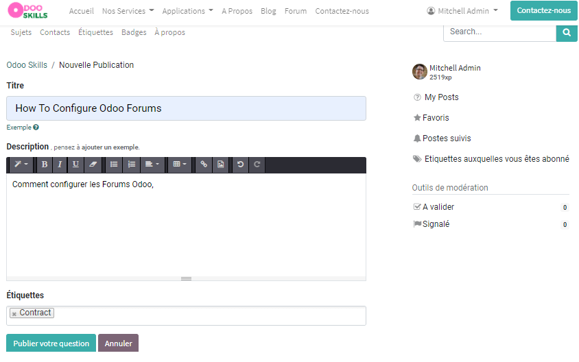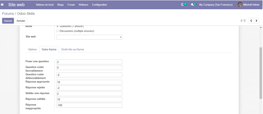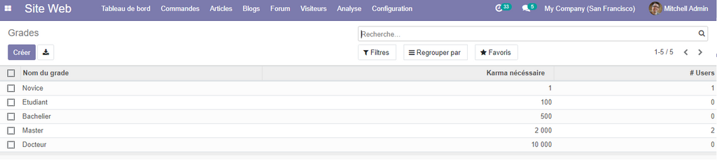 Par défaut, Odoo donne des droits de 1 à 1000 Points récoltés. 1 vous permet de modifier ses question et 1000 vous donne la possibilité de modérer les messages.