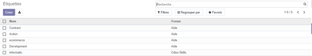 Les étiquettes :Les étiquettes (Tags) sont des éléments qui vous permette de classifier votre contenu du forum, dans cette partie vous pouvez créer les étiquettes souhaitées ( Odoo14, Odoo fonctionnel, Odoo technique, Achat,…..), vous pouvez également préciser le Forum de ces étiquettes, et les attribuer aux différents Posts.
