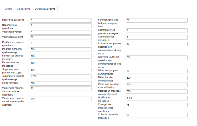 Entre ces deux valeurs on trouve des niveaux variés des droits (valider ces propres repenses, étiquettes, poser une question sans validation, convertir toutes les questions en commentaires et vice versa, créer des nouvelles,). Par souci de simplification, Vous pouvez laisser ces options par défaut.