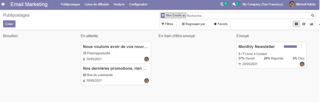 • En enregistrant votre publipostage, il sera mis automatiquement en état brouillon, vous pouvez le visualiser dans la vue Kanban.