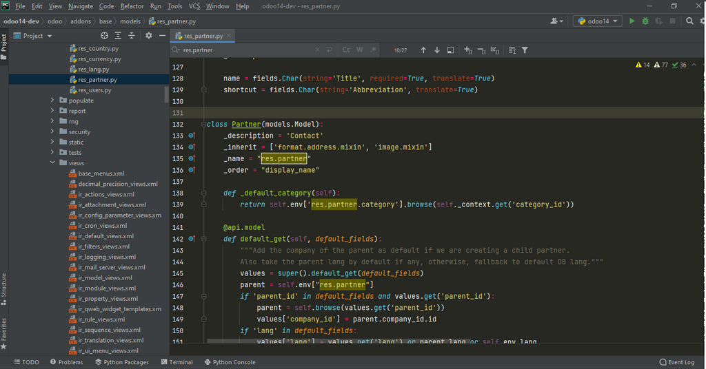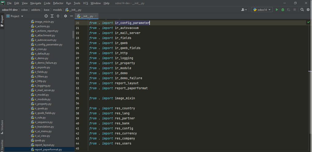Pour l’ouvrir, il suffit donc d’ouvrir Odoo à partir de notre IDE Pycharm (ou un autre IDE), puis d’explorer le répertoire addons, et enfin ouvrir le répertoire base.