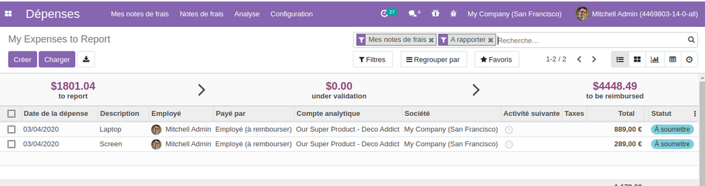 Pour avoir une vision plus claire sur les dépense de la société, on a ajouté un tableau de bord qui comporte un résumé sur les frais engagé par l’entreprise.