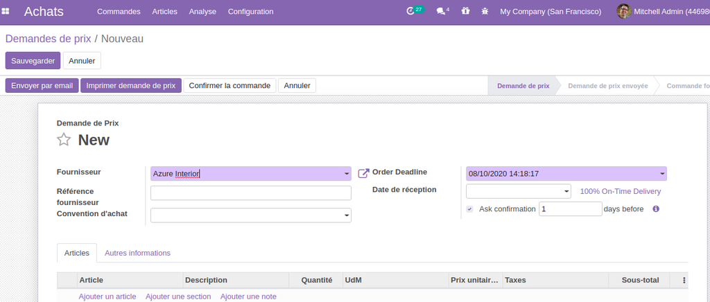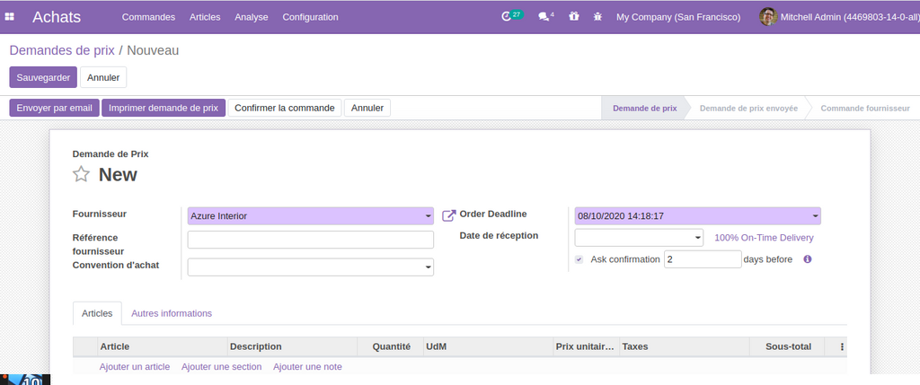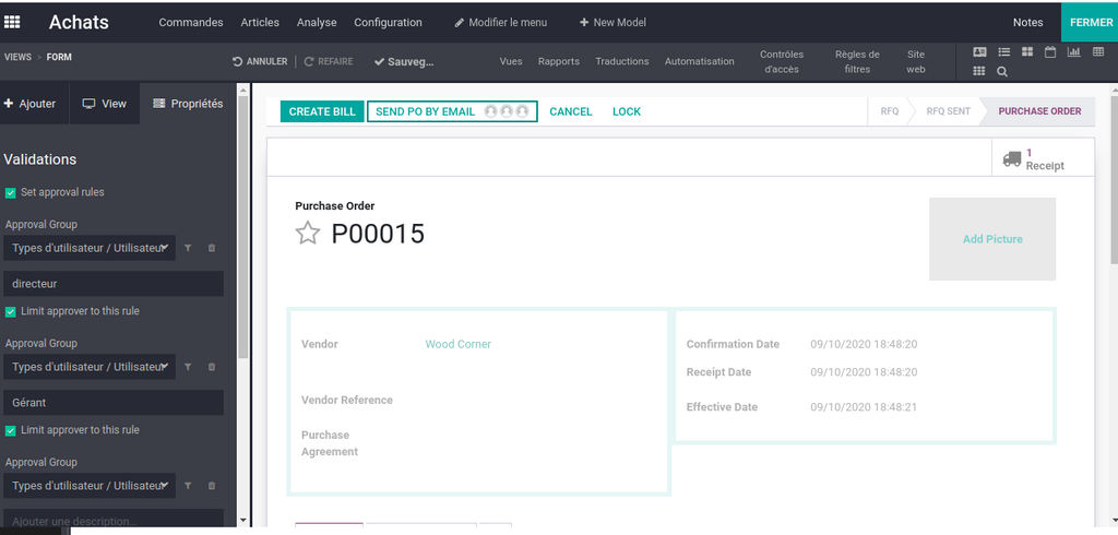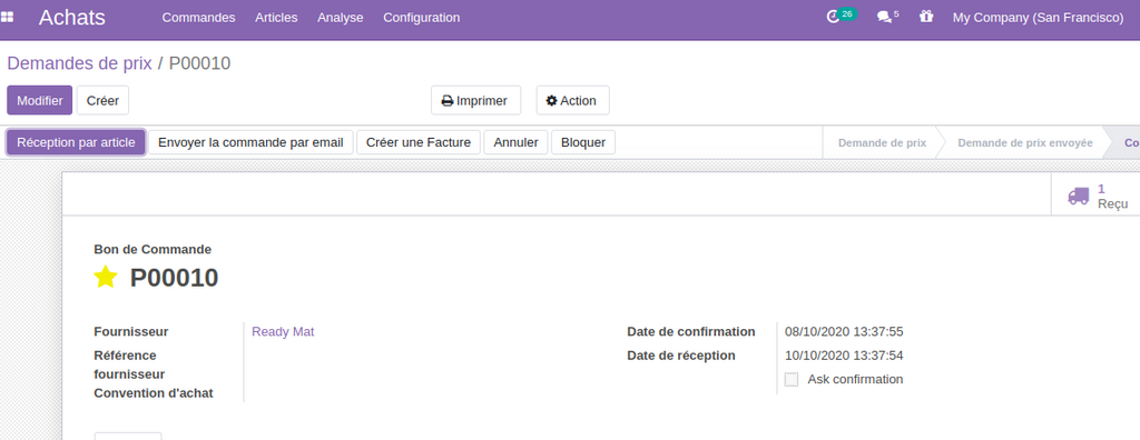 Encore pour s’assurer de l’arrivé de la commande fournisseur , nous pouvons demander au fournisseur de  Confirmer la date d’envoie de la commande , avec une notification de la date , en envoyant un email contenant les produits de la  commande,  et pour chaque produit le fournisseur peut  définir  la date de livraison prévue.