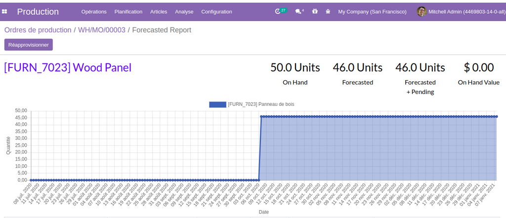 Dans la partie gestion de production, il est désormais possible de gérer les quantité des produits dans l’ordre de fabrication, à travers la possibilité de prévision des quantité en visualisant le diagramme de prévision de disponibilité ,  avec souplesse de modification dans l’OF si vous voulez ajouter d’autres composants