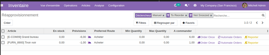 Nouvelle Option du menu  Opération intitulée  approvisionnement pointant vers une liste qui affiche l’état de chaque demande de réapprovisionnement.