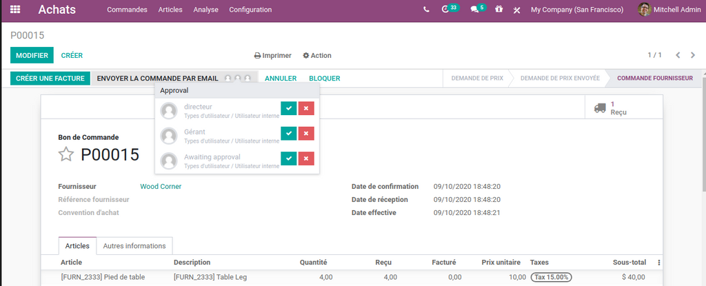 Iil est désormais possible de personnaliser le workflow selon les règles de votre entreprise ( les étapes de validations ou Approvals en Anglais) . par exemple lorsque le montant de la commande fournisseur est important ( supérieur à 5000 $ par exemple)  , il faut ajouter d’autres étapes qui sont la signature du directeur d’approvisionnement + la signature du DG par exemple .
