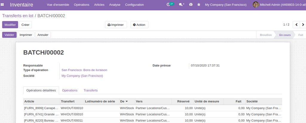 Dans la partie inventaire, et afin d’être plus pratique et plus rapide, il est maintenant possible de regrouper plusieurs bons de livraisons  en un seul lot de transfert  ou batch, puis les faire livrer au partenaire à la fois.