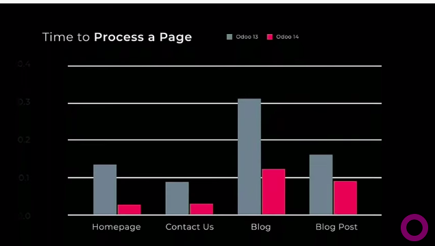Odoo 14 , le temps moyen de chargement d’une page 3.42  plus rapide que la version, odoo 13, et les tableaux de type pivot, utilisé principalement pour la partie BI (Business Intelligence), sont 40 fois plus rapide qu’ Odoo 13, à cause de l'utilisation d’owl (Odoo Web Library ) .