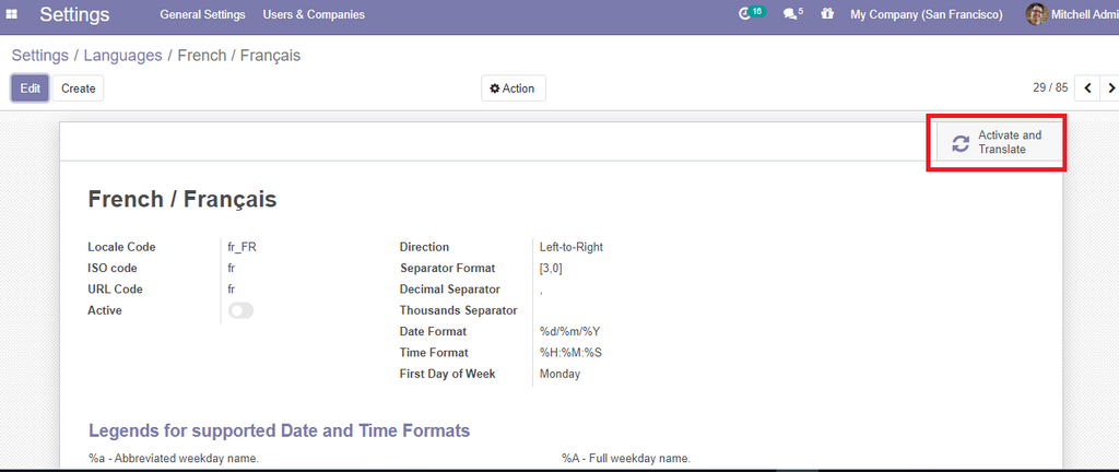 Rechercher et modifier la langue par défaut, en choisissant  french/Français puis cliquer sur save . Enfin la langue sera changé en Français. (Cette méthode est pareil pour charger toutes les autres langues prises en charge par odoo par défaut ).