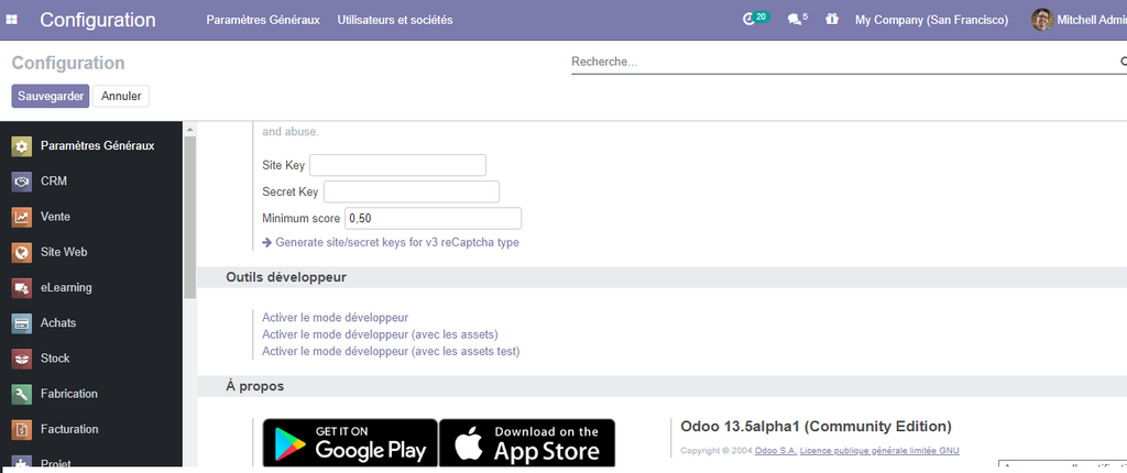 A Présent , vous avez activer la puissance cachée d'odoo ! et vous avez accès au mode développement, et plusieurs fonctionnalités sont activées .